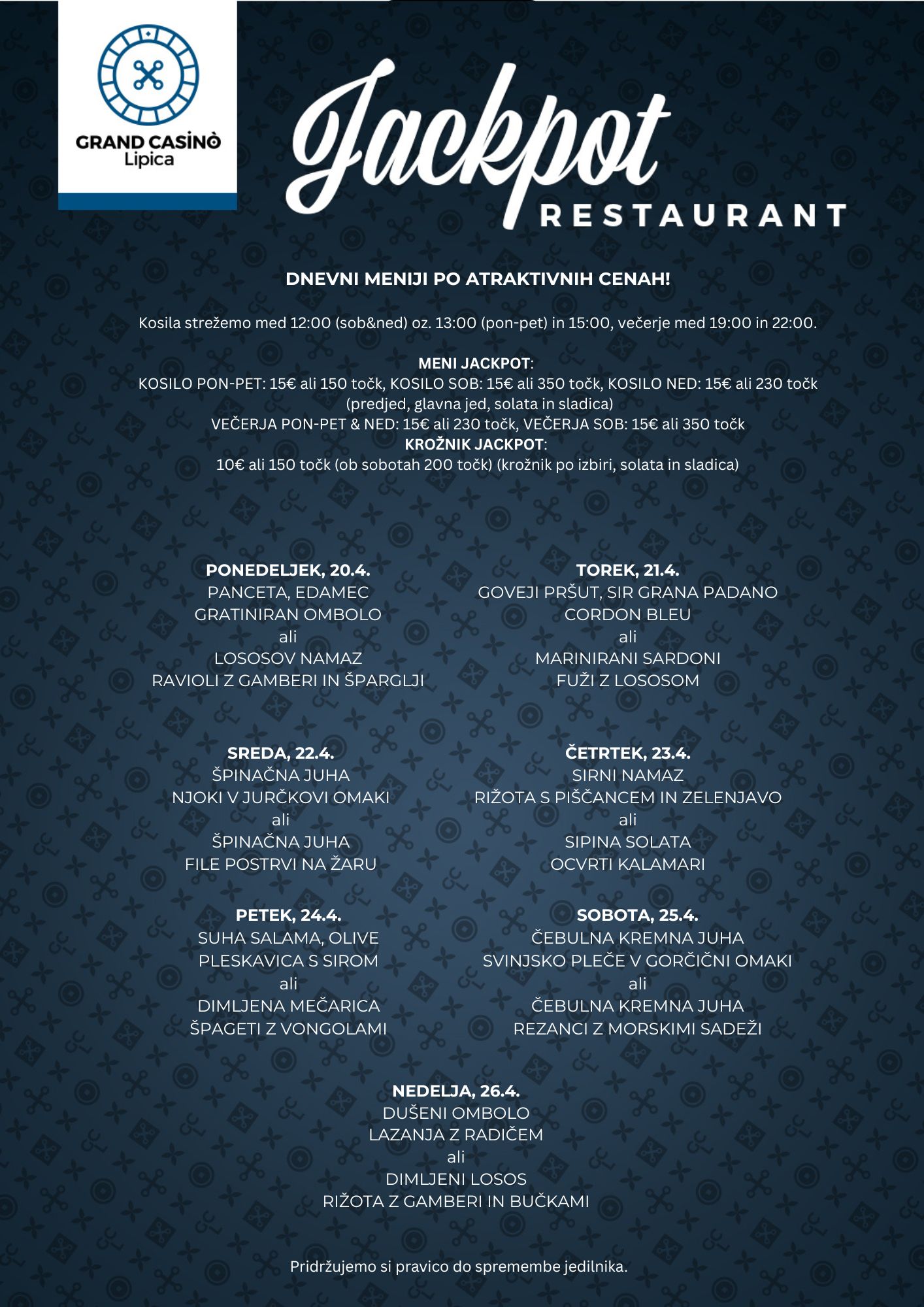 Obiščite svet zabave, razkošja in elegance ter se prepustite pisanemu svetu iger in kulinaričnemu razvajanju v eni izmed dveh restavracij, kjer vam bomo postregli izvrstne jedi mediteranske kuhinje.